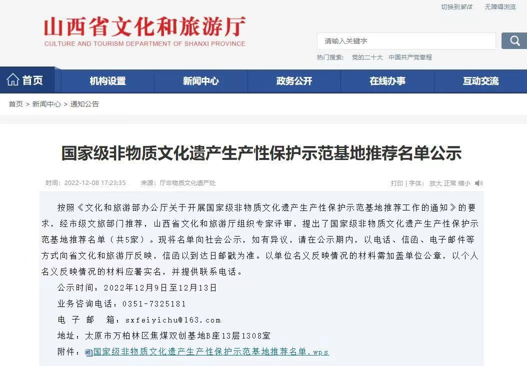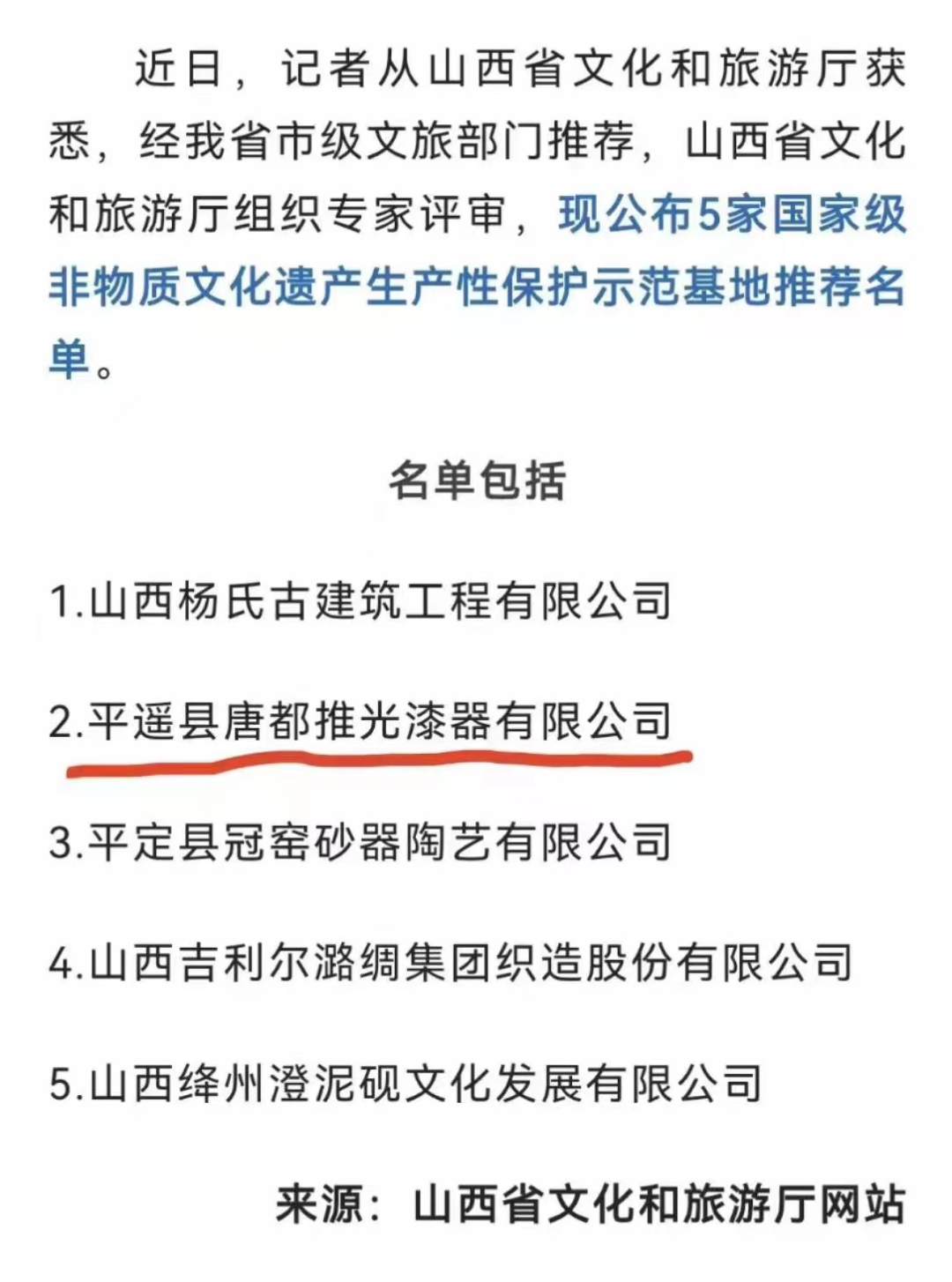 近日,根據《文化和旅游部辦公廳關于開展國家級非物質文化遺產生產性保護示范基地推薦工作的通知》,經市文旅部門推薦,山西省文化和旅游廳組織專家評審,平遙唐都推光漆器有限公司入選“國家級非物質文化遺產生產性保護示范基地”推薦名單。